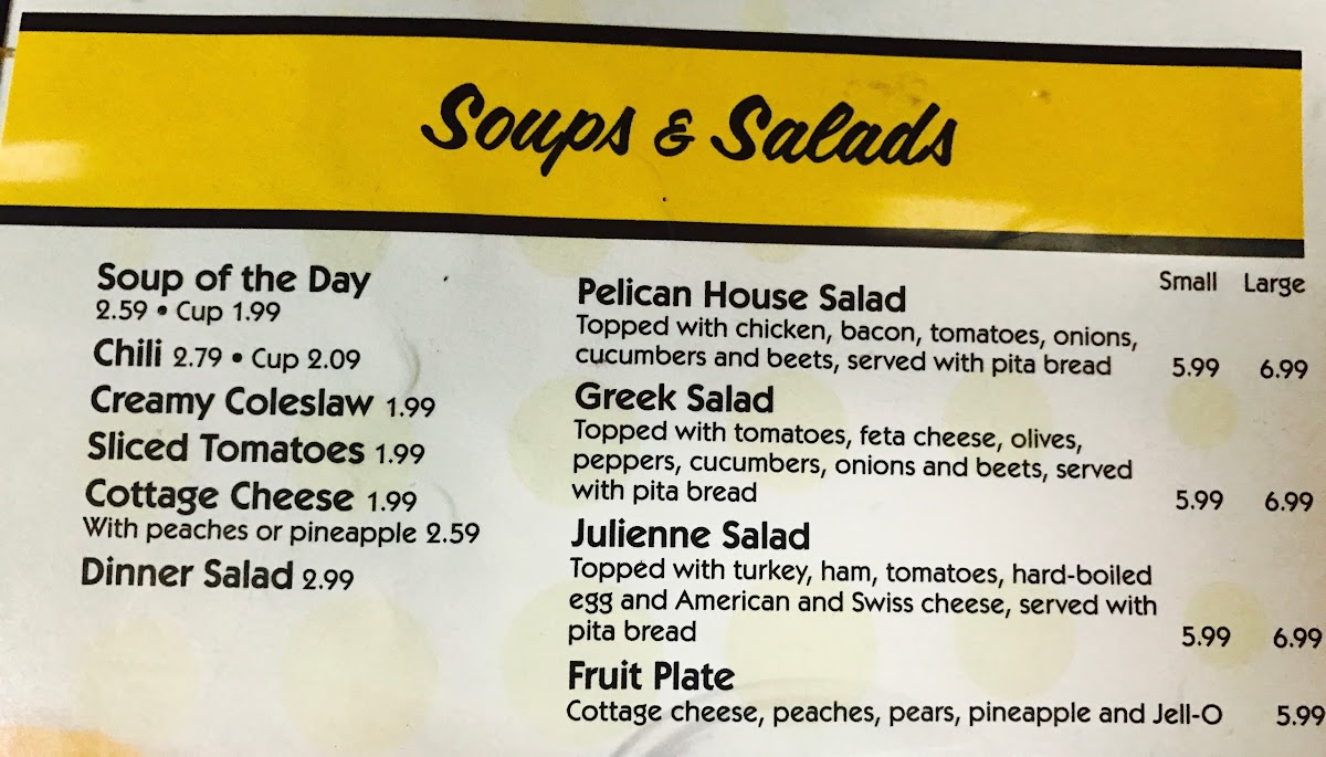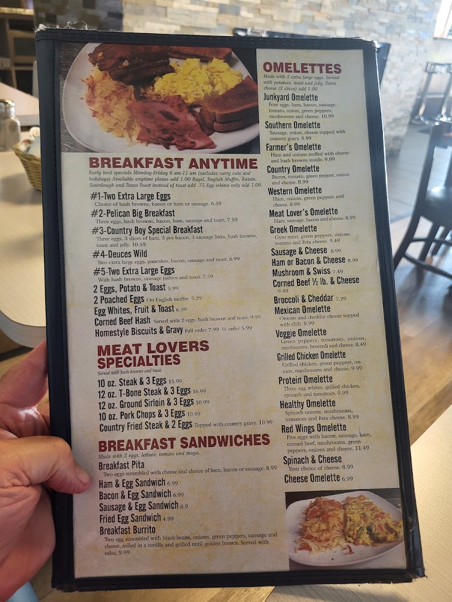 Whether you're starting your day with classics like Over Easy Eggs More Like Fried Eggs or the Country Boy Special Breakfast, or enjoying midday favorites such as the Philly Cheese Steak or the Pelican Chicken Pita, the menu complements the casual, homey atmosphere of the cafe. The versatility of options—from skillets packed with fresh ingredients to hot sandwiches served with traditional sides—makes it easy to find something comforting and approachable.